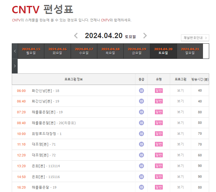 일요일 기준으로 최근에는 화간신낭, 장희빈, 대조영, 은희, 천개의 비밀 어메이징스토리, 붉은단심 등이 방영되고있습니다. CNTV는 전국 케이블방송과 위성방송(스카이라이프), IPTV(kt 지니TV, SK Btv, LG U+ TV)에서 시청하실 수 있습니다. 자세한 사항은 CNTV 홈페이지를 참고하세요!